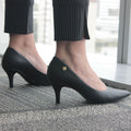 - Matte napa leather-look upper- Black hue- Pointed toe- Low-cut vamp- Polished gold-toned branded applique to outer quarter- Structured 7 cm stiletto heel- Extra comfort rubber sole - Memory foam lined interiorMade in Brazil