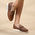 A versatile tan loafer with warm undertones and a refined gold hardware accent. The soft synthetic upper and cushioned footbed ensure comfort for all-day wear, while the clean lines make it easy to pair with casual or office looks. - Matte leather-like upper- Hazelnut (tan) hue- Off-white sole with tan trim for contrast- Gold metal bit detail- 1.5cm wedged heel- Slightly elevated sole for support- Cushioned insole with soft lining Made in Brazil Modare is all about comfort and elegance as its soles are constructed in the latest technology to mould perfectly in your feet - it's like the shoe was tailored for you, and the feeling is unique. Walk all day long in any Modare from Charley.