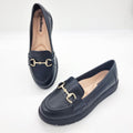 Introducing the Moleca 5803-101 Round Toe Loafer Flat in Black - the ultimate combination of style and comfort. This go-anywhere loafer boasts a classic, sophisticated look with classy details. The padded inner sole ensures all-day comfort, making it the perfect addition to any fashionable outfit. - Napa leather-look upper- Black hue- Rounded toe- Classic horsebit detail in gold- 3cm flatform- Extra comfort, non-slip lugged sole- Softly lined interiorMade in Brazil Moleca brings a younger feeling to every wardrobe. Ballerinas in all colours and shapes are the perfect example of the values that the brand wishes inspire: freedom and style. Grab your favourite Moleca and get addicted to Charley.