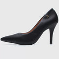 - Napa leather-look upper- Black hue- Pointed toe- Low-cut vamp- Polished gold-toned branded applique to outer quarter- 10cm covered stiletto heel- Extra comfort rubber sole- Anti-bacterial and antiperspirant inner fabricMade in Brazil