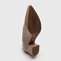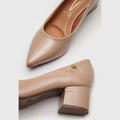 - Patent leather-look upper - Beige hue - Pointy toe - 5 cm block heel - Comfortable inner-sole with extra padding - Anti-bacterial, anti-perspirant and heat absorbent inner fabric